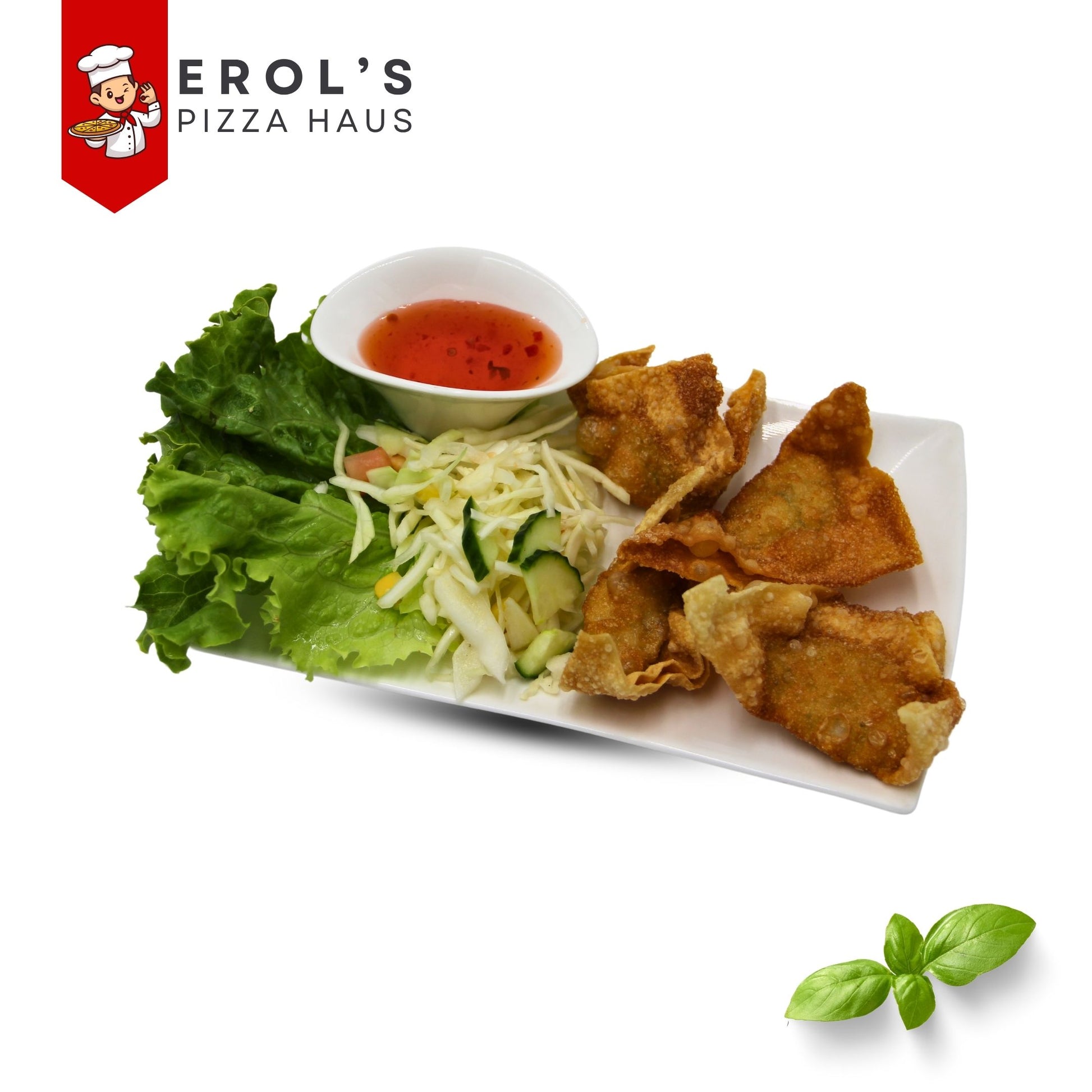 4 frittierte Reisteigtaschen gefüllt mit Poulet Fleisch, Knoblauch, Karotten und Schnittlauch