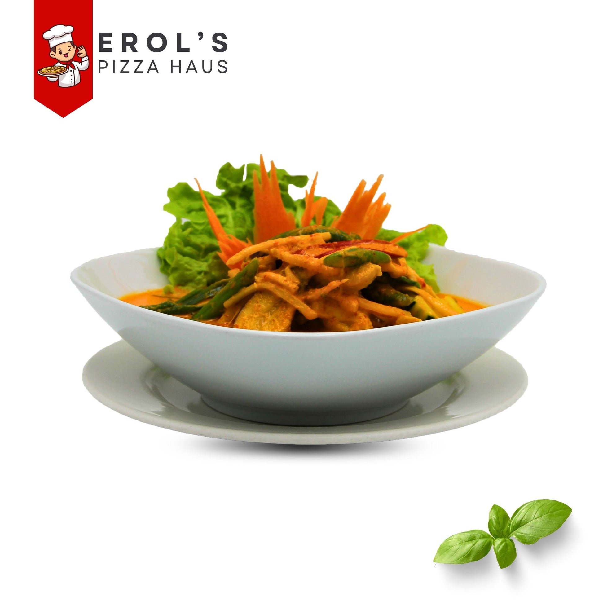 Typisches Gericht mit Thai-Chili, Thai-Bohnen, Thai-Basilikum, Knoblauch, Zwiebeln und Bambussprossen - Nach Ihre Wahl mit*